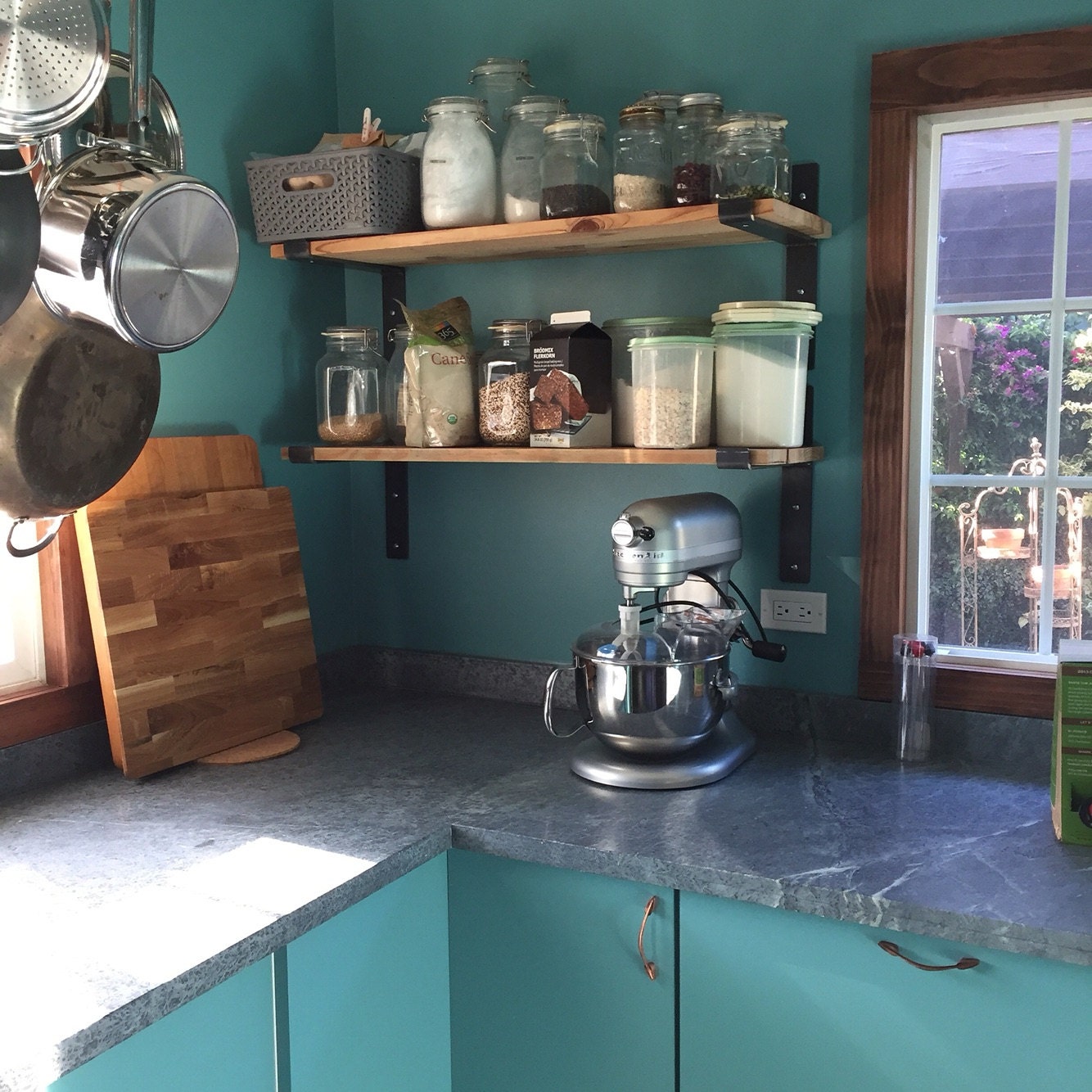 Black Metal Shelf Bracket Modern Open Kitchen Shelving ... from i.etsystatic.com Scrolling metal design work throughout. One of typically the most popular kitchen decorating ideas nowadays is to decorate with all the retro design, while there are many types of. Open kitchen wall shelves isn't a storage solution for everybody. In this review we want to show you metal kitchen shelf. Simple wooden shelves lend a rustic touch to this modern kitchen corner. Shaker style joinery and simple detailing contrasts with the stunning oxford grilles inset into cabinet doors, provide a surprising decorative element alongside bournville handles. The wood and metal combo suits these kitchen shelves well, especially with. Shop for kitchen and bathroom furniture organization and home storage solutions.